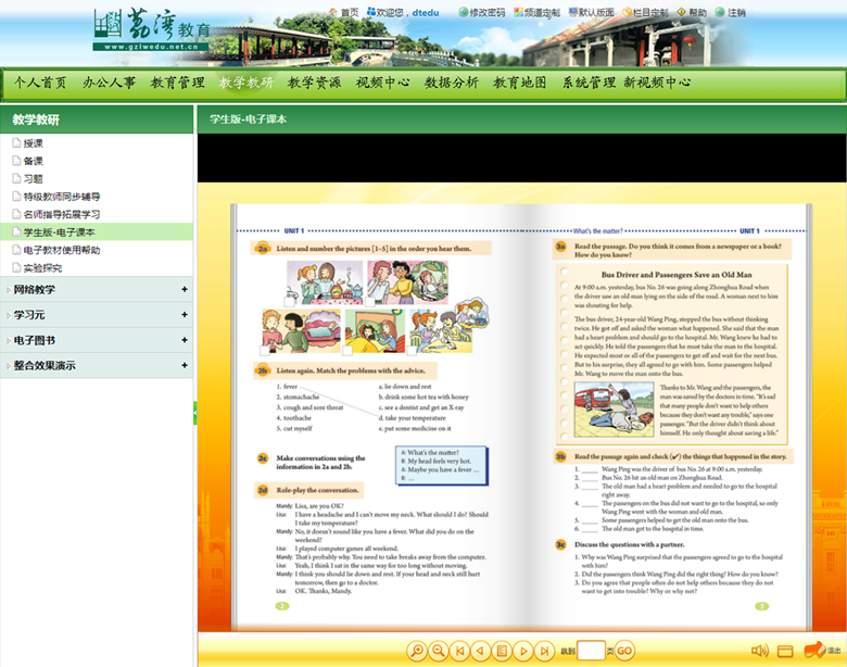 荔湾区教育局相关负责人介绍,一本“数字化教材”= 电子课本+教参+教学课件+录音+视频+动画+互动软件+练习册,分教师版和学生版。电子课本的资源根据各科目的特点有不同的功能,如英语科具有课文点读、重点词汇检测的功能,数理化生等探究型学科则具有实验视频点播的功能。